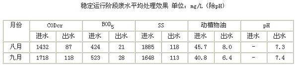 從上表可知,在穩(wěn)定運行期間, CODcr的平均去除率為93.5%;BOD5的平均去除率為94.8%; SS的均去除率為93.5%;動植物油的平均去除率為83.4%。廢水處理系統(tǒng)排放水中pH值、動植物油、CODcr、BOD5、SS六項指標均達到GB8978-1996《污水綜合排放標準》表4中三級標準。